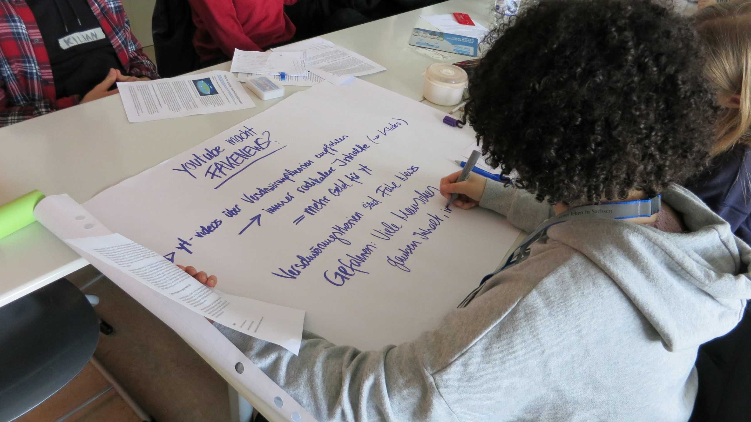 Bei der Stationsarbeit zum Thema „Hate Speech“ ging es darum, dass die Schüler*innen selbst über Ursachen und persönliche sowie gesellschaftliche Auswirkungen von Hassrede im Internet nachdenken. Danach haben wir gemeinsam mit den Teilnehmenden über Strategien im Umgang mit Hassrede im Internet beraten.