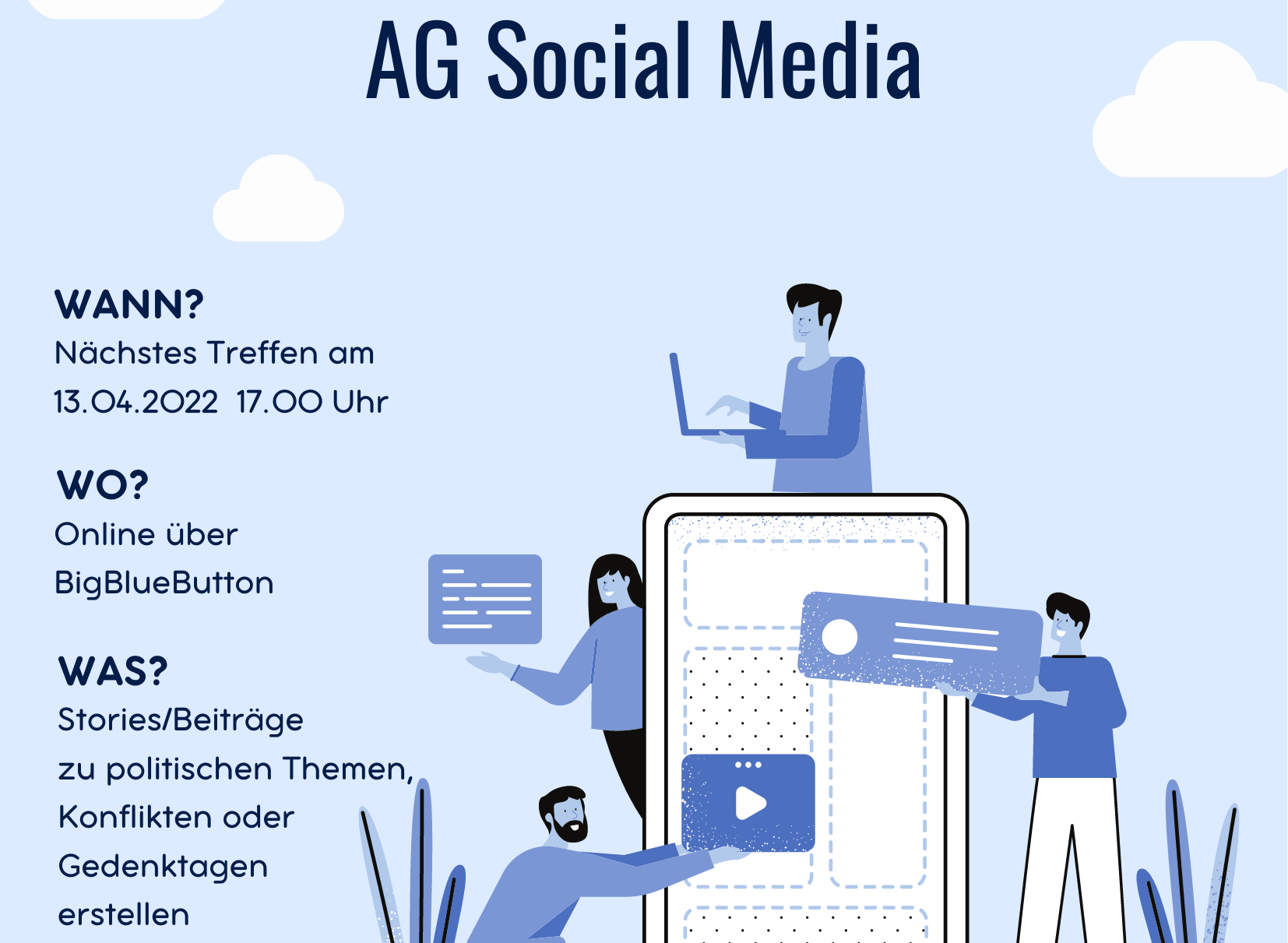 Hallo, am Mittwoch, den 13. April 17.00 Uhr treffen wir uns wieder in unserer AG Social Media, um die nächsten Stories und Beiträge zu unseren politischen Themen und Veranstaltungen zu planen. Wir freuen uns, wenn du dabei bist. Melde dich einfach bei und und du bekommst am Mittwoch Vormittag den Link zum Onlinetreffen.