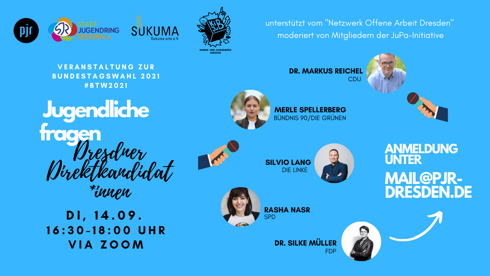 Teilnehmen werden Dr. Markus Reichel (CDU), Merle Spellerberg (Grüne), Silvio Lang (Die Linke), Rasha Nasr (SPD) und Dr. Silke Müller (FDP).