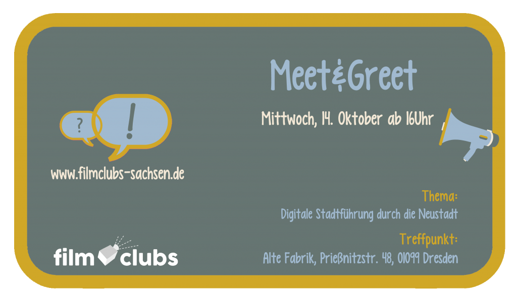 Alle zwei bis drei Monate hast Du die Gelegenheit, die Filmclubs und die Mitglieder näher kennenzulernen. Dazu veranstalten wir ein „Meet&Greet“, ein gemütliches Zusammensein mit Filmclub-Mitgliedern, snacken und quatschen. Komm einfach vorbei und bring gern Freund*innen mit, egal ob Du schon Filmclub-Mitglied bist oder nicht.